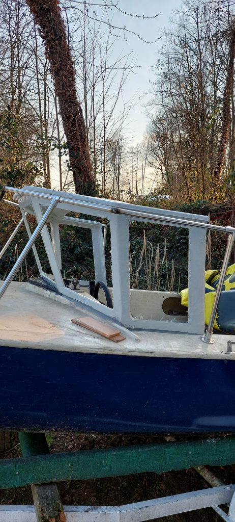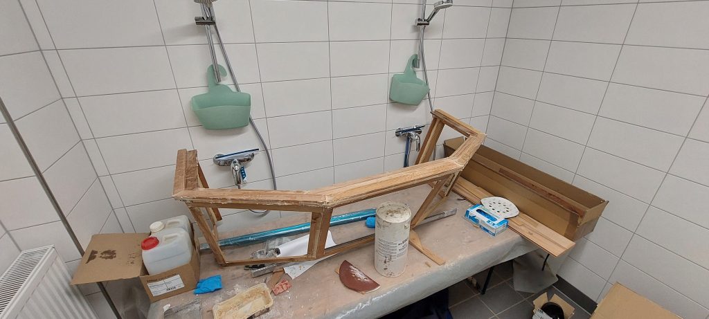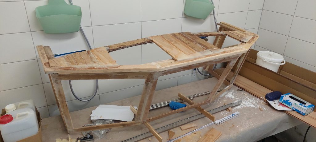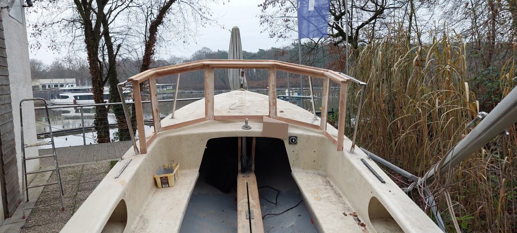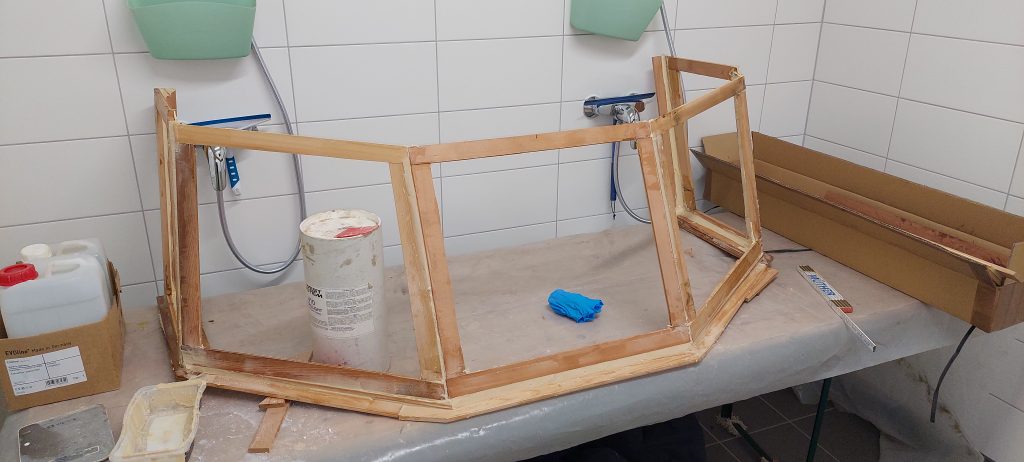 Dann sollte das Boot auch einen Aufbau mit festen Scheiben bekommen, an der später die Cockpitabdeckung befestigt werden kann. Diese wurde aus Zedernholz gefertigt und anschließend mit GFK überzogen.