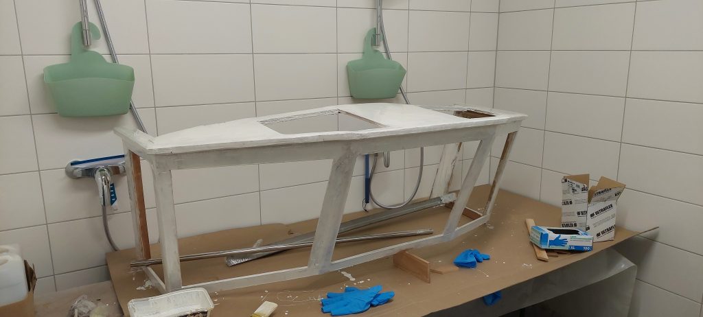 Als erster Schritt wurde der Rumpf verstärkt und der Schacht für den Motor gesetzt.